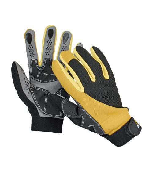 Finom hasított bőr tulajdonságaival rendelkező szintetikus anyagból varrt kesztyű csúszásgátló felületű ujjakkal, erősített tenyérrésszel, könnyű mozgást biztosító finom nylonszövettel az ujjak oldalán és tépőzárral állítható mandzsettával. Fekete-sárga.