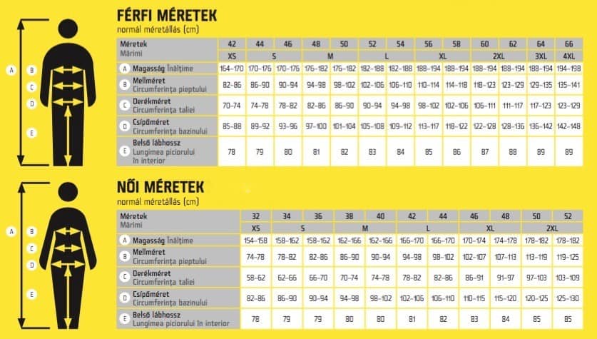 Cerva munkaruházat mérettáblázat: