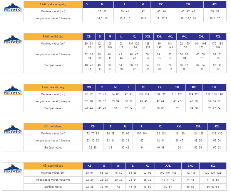 Portwest mérettáblázat: