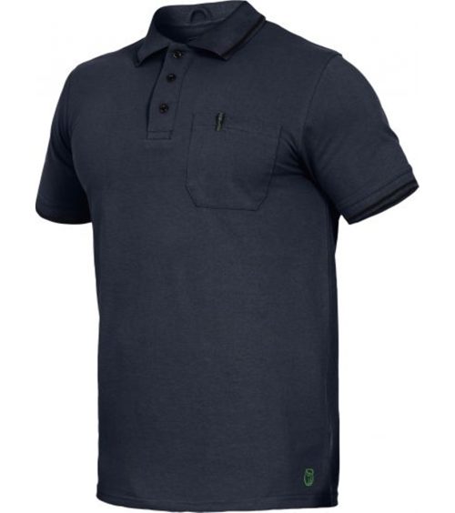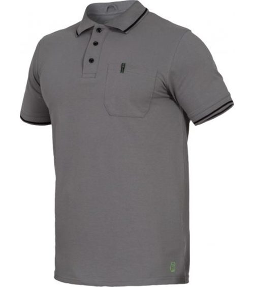 3 gombos, galléros rövidujjú póló, elöl egy zsebbel, tartós anyagból.
