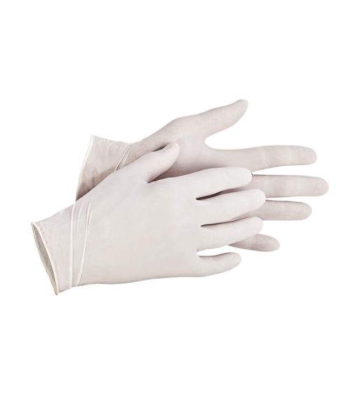 Élelmiszerekkel való rövid idejű érintkezésre alkalmas, egyszer használatos, púderezett latex kesztyű. Zsíros élelmiszerekkel való érintkezésre ellenőrzött kesztyűk.
