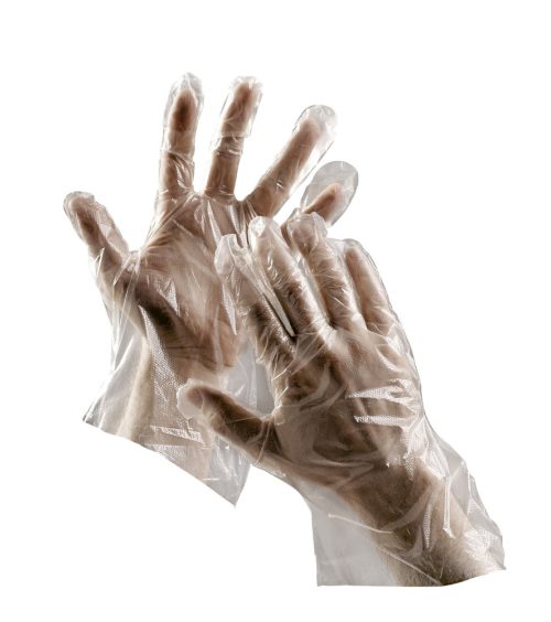 Élelmiszerekkel való rövid idejű érintkezésre alkalmas, polietilén fóliából készült, egyszer használatos kesztyű.