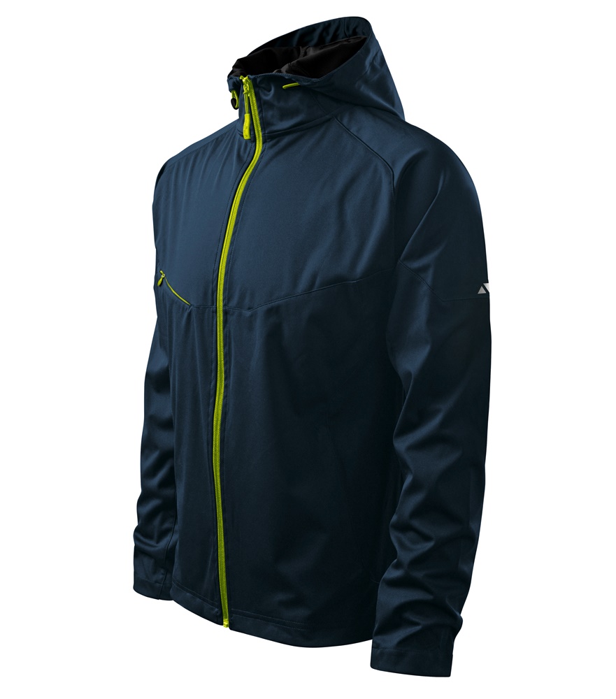 Könnyű Softshell kabát kapucnival – a kapucni összehúzható elasztikus zsinórral. Víz és szélálló, légáteresztő kabát. Végig cipzáras. A dzseki ujjának alsó szegélye tépőzárral állítható. Rejtett zsebekkel, kontraszt és fényviszaverő elemekkel.