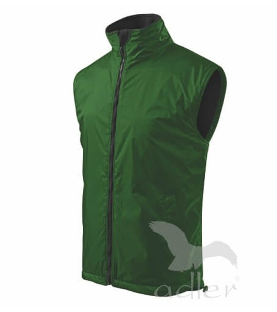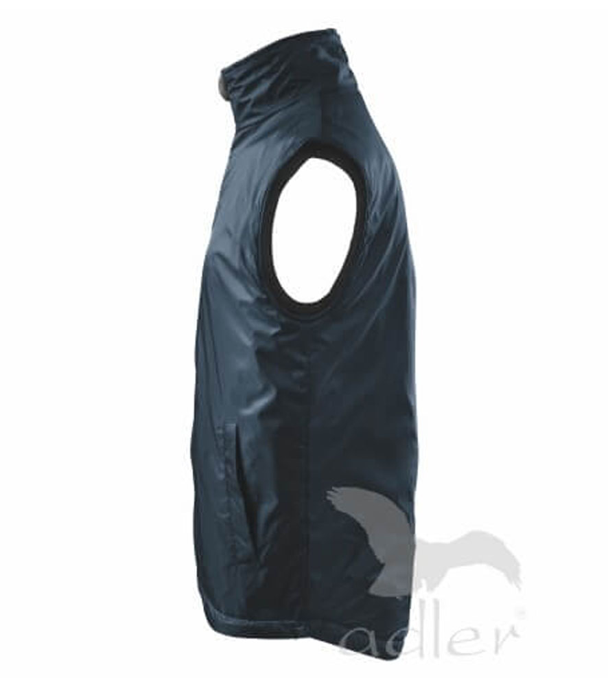 Férfi melegítő mellény, két elülső szegélyes zseb. Kontraszt bélés. A cipzár fleece szegőpánttal van védve. Az alsó szegély rugalmas zsinórral húzható össze. Meghosszabbított hátsó rész. Két belső mellzseb (1kisebb mobil telefonra, 1nagyobb). Akasztófül. Szőtt etikett. Nyomtatásra és hímzésre alkalmas.
