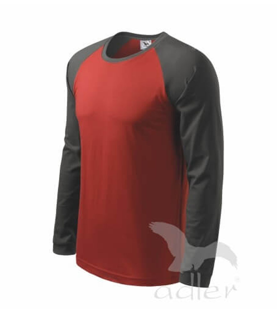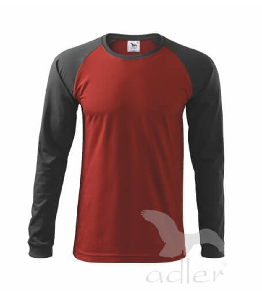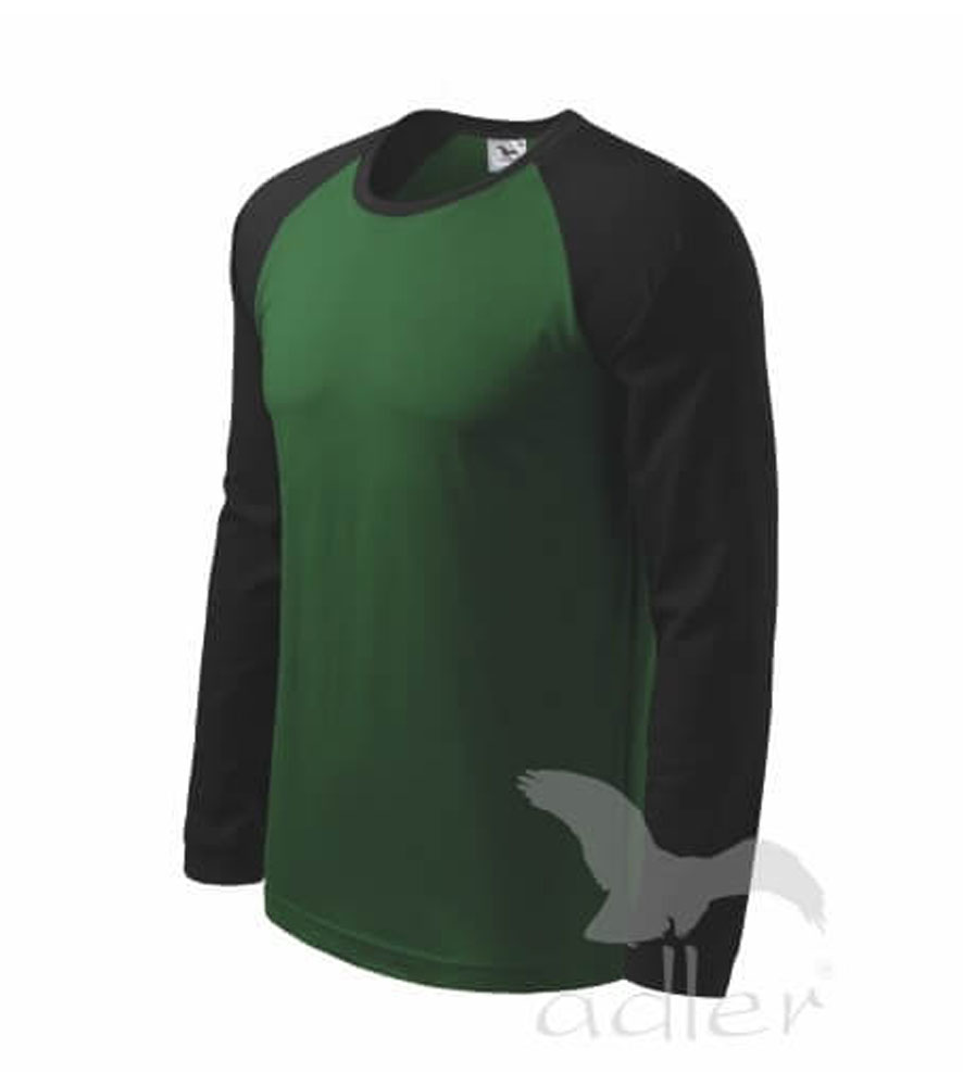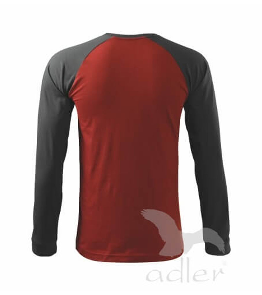 Magas grammsúlyú jó minőségi férfi póló hosszú ujjú raglán ujjakkal. Divatos keskeny csík a nyakrészben, az ujjak a színes variánsban kontraszt színben.