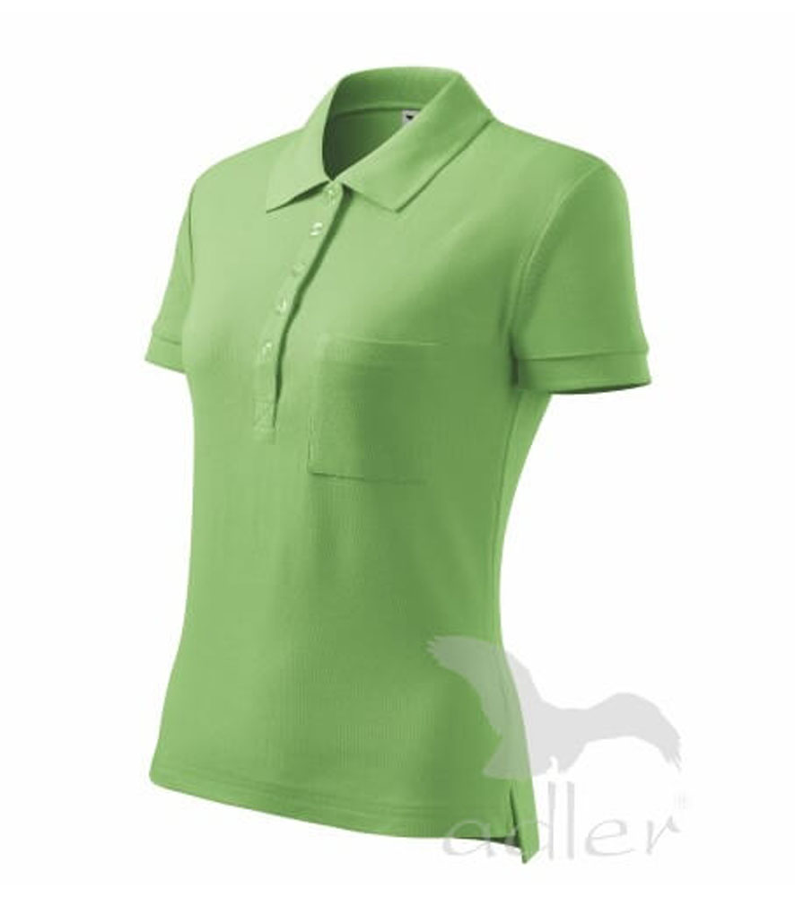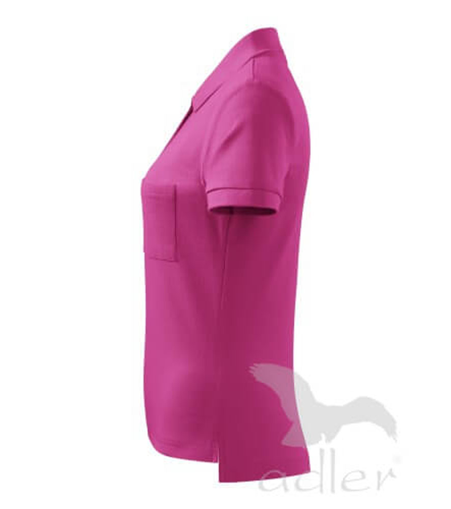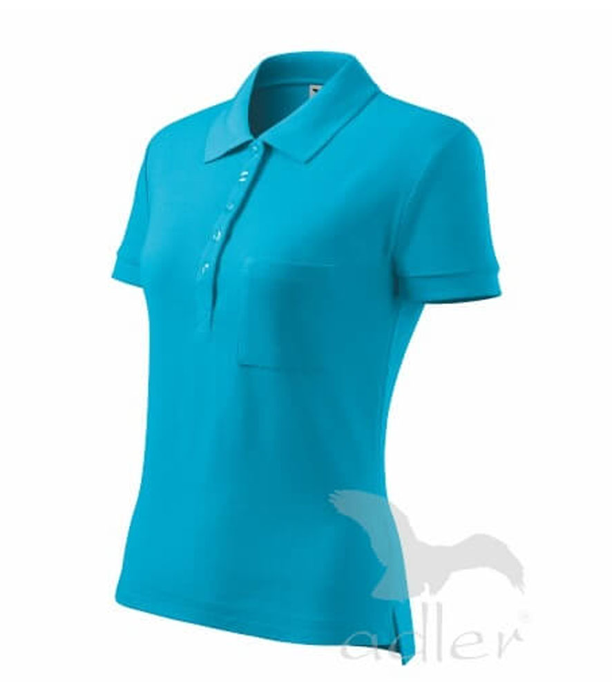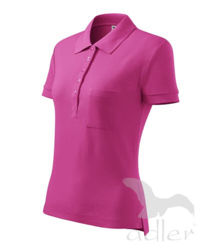 Női galléros póló közepes grammsúllyal, karcsúsított szabással. . Gombolópánt 5db., az anyag színével megegyező gombbal. A gallér és az ujjszegélyek bordázott kötésű anyagból. Mellé helyezett mellzsebbel a branding könnyebb alkalmazhatóságáért- nincs rávarrva.