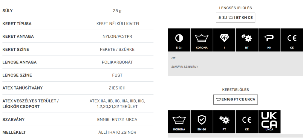 Páramentes bevonattal! Így pl.:a hűvös autóban hagyva, a szemüveg felvételekor nem csapódik ki a lencsékre a pára!- A lencse ellenáll a 0,86g tömegű 6mm átmérőlyű 120m/s-os sebességű acélgolyónak (airsoftosok is gyakran választják)