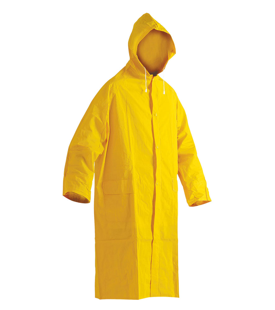 Vízálló esőkabát kapucnival. Bővített hossz. PVC bevonatú anyag. Mellső zsebek hajtókával védve a víz bejutásától.