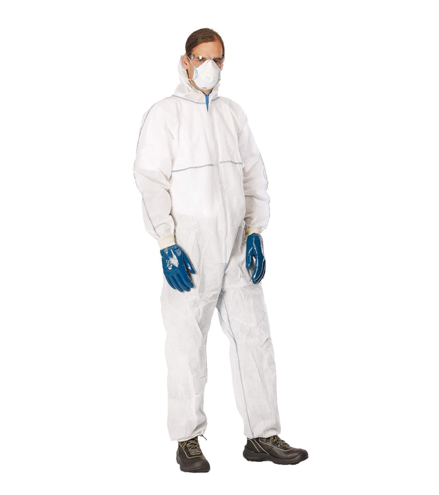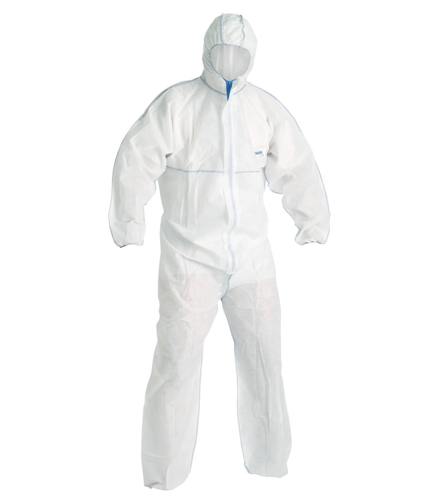 Csuklyás védőoverall hajtókával fedett cipzárral, valamint gumival összehúzható ujjal és nadrágszárral. Az öltözék a CE III. osztályba, az 5., és 6. típusba tartozik, és egyes vegyszereknek is ellenáll. Fehér.