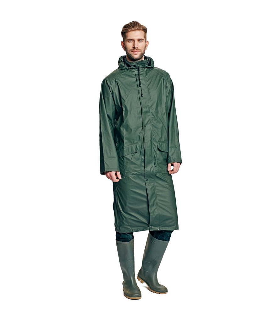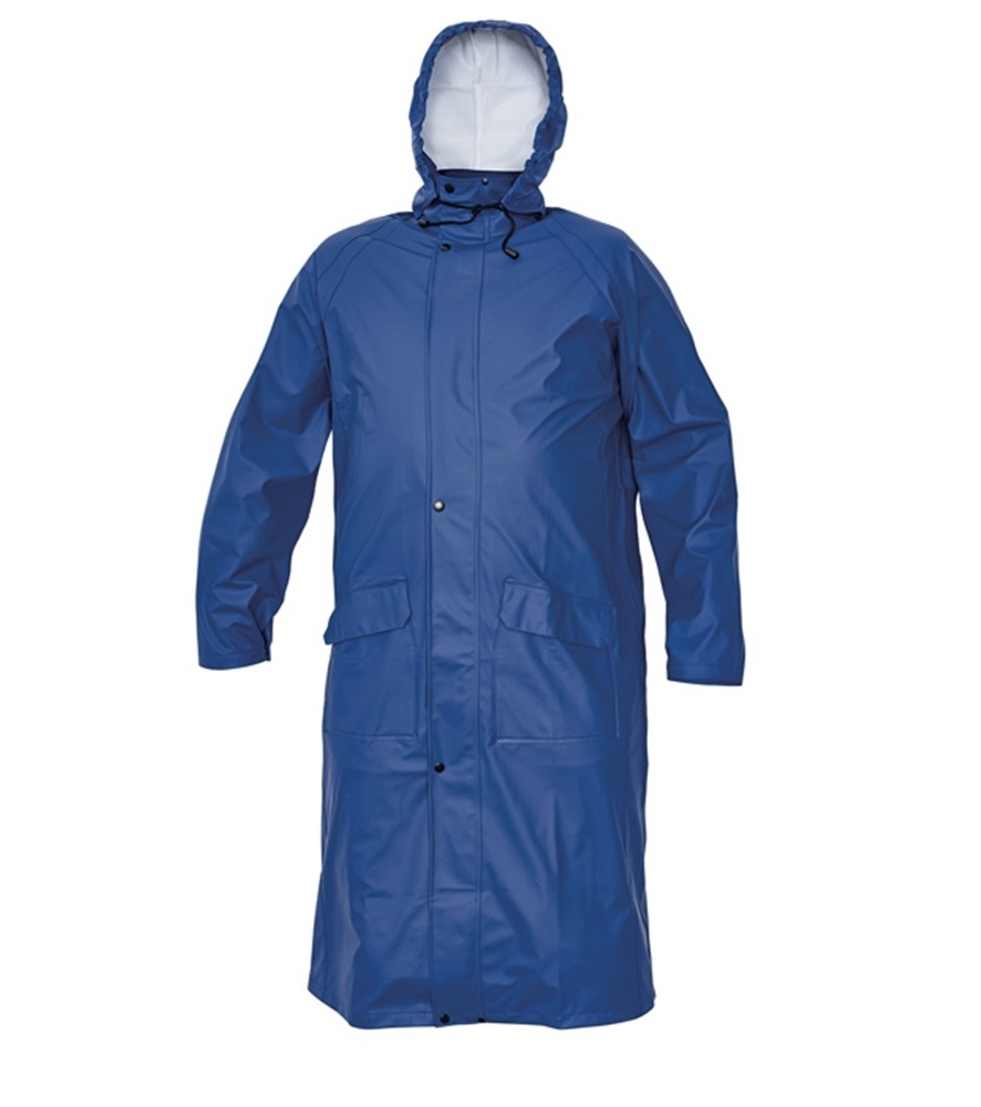 Vízálló és szélálló bő szabású esőkabát, gallérba hajtott kapucnival. Kettő széles mellső zseb hajtókával védve a víz bejutásától az ujján patenttal állítható.