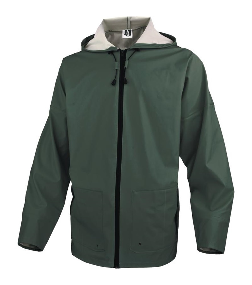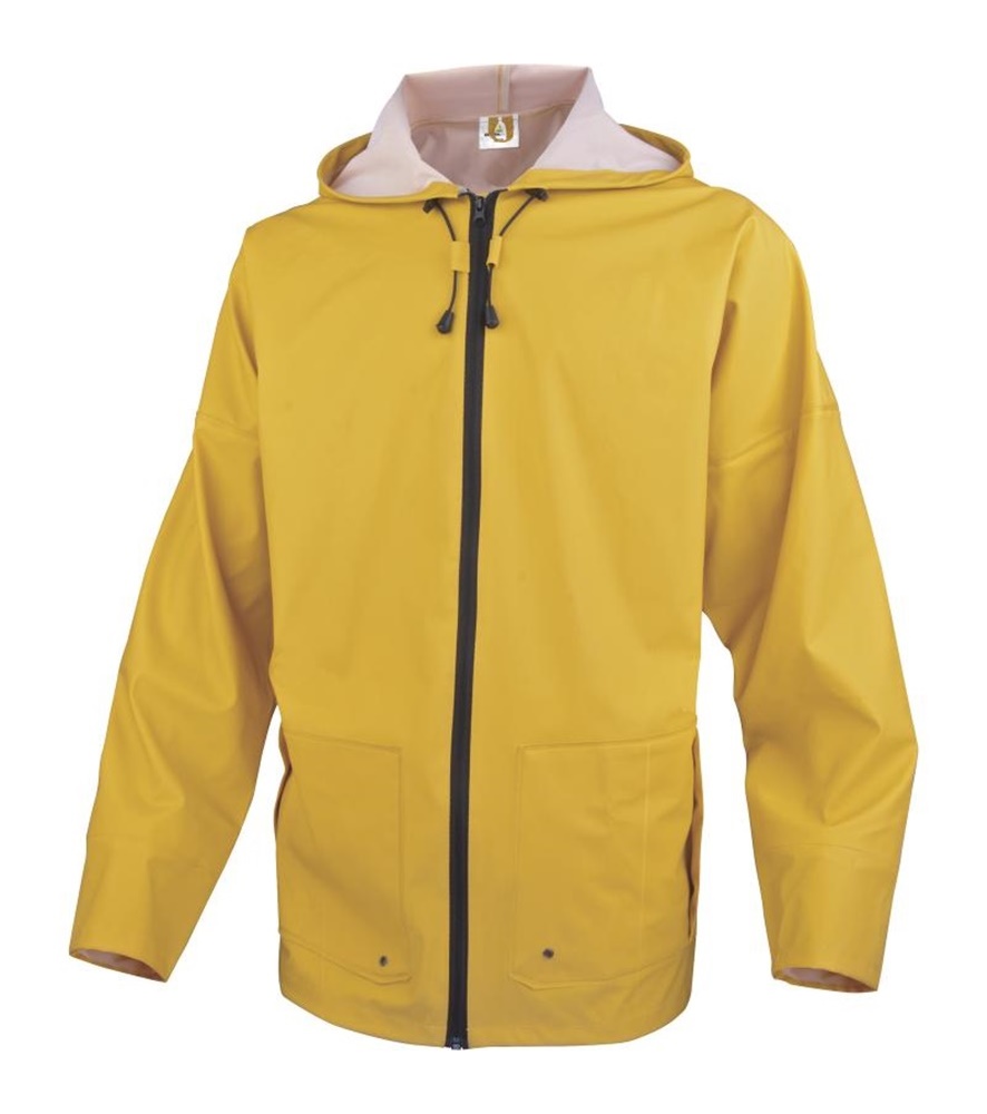 Eső elleni védőruházat. Poliészter alapra mártott fél-poliuretán esőkabát.