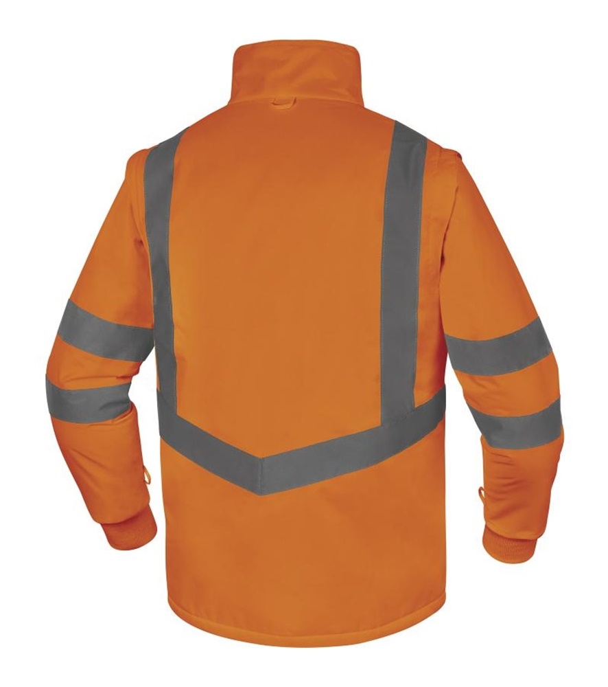 Kivehető mellény: Levehető ujjú. Vízálló varrás. Cipzárral záródó. Passzés csuklórész. 3 zseb, köztük 1 cipzáras belsővel. Jól láthatóság : 3. osztály – Kantár formájú csíkozás.