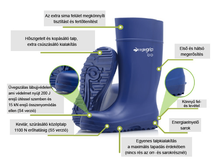 - Az EagleGrip® csizma kivételes tapadást biztosít extrém környezetben, például zsírral borított sima padlón. Ez egy csúszásmentes külső talp, amely jobban ellenáll a kopásnak, a vegyszereknek, az olajoknak, az oldószereknek és a hőmérsékletnek.