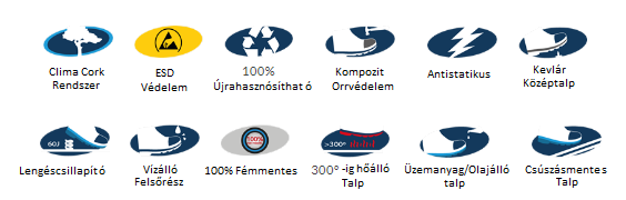 ESD – elektrosztatikai vezetőképesség ,HRO -kontakt hőhatással szemben védőtalp (300°C /60s) |