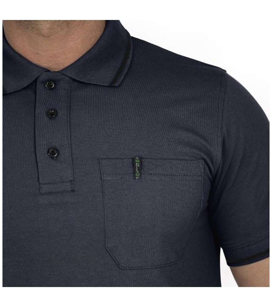 3 gombos, galléros rövidujjú póló, elöl egy zsebbel, tartós anyagból.
