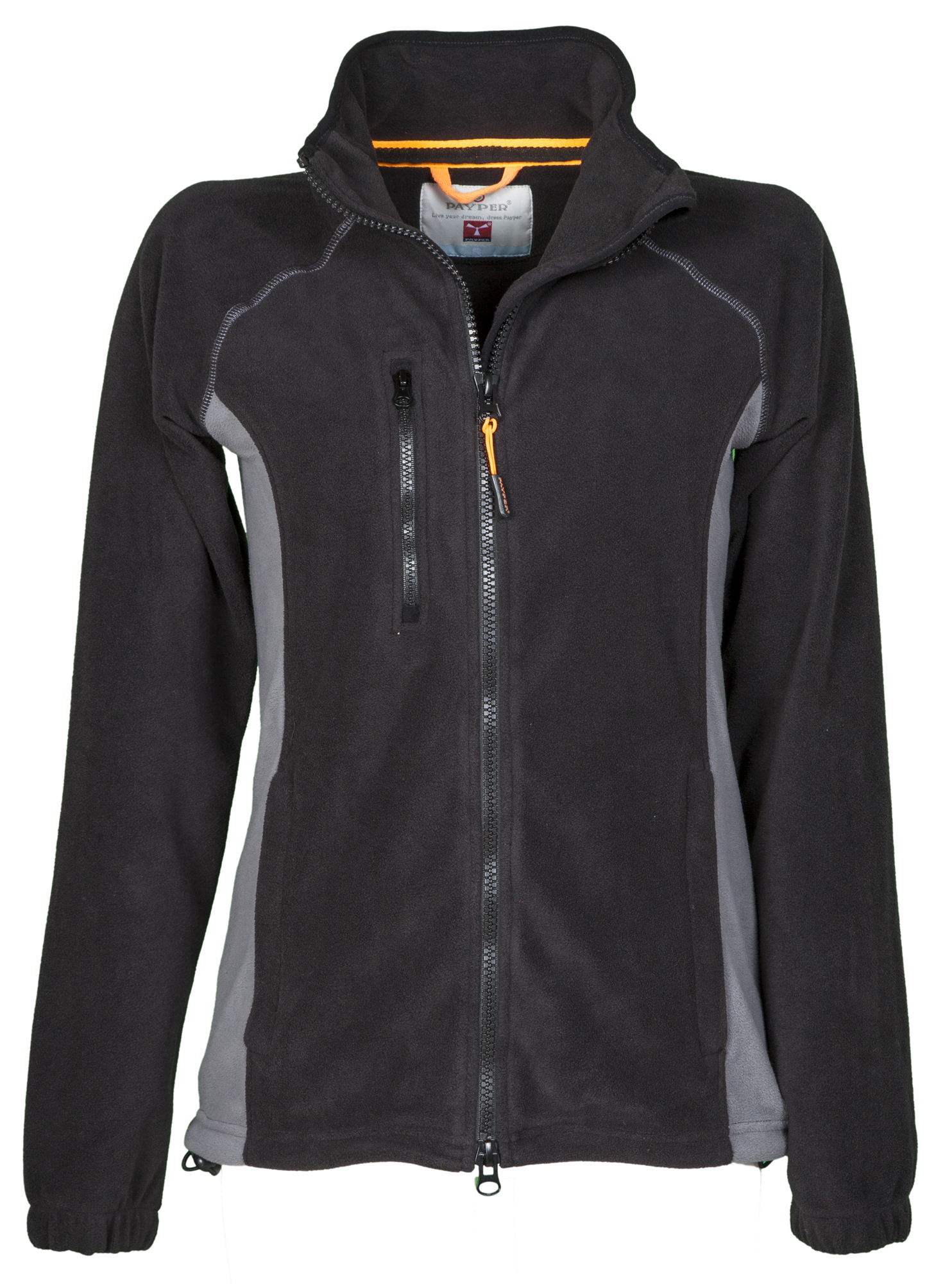 Kontrasztos női polár kardigán fekete cipzárral, állítható derékkal.