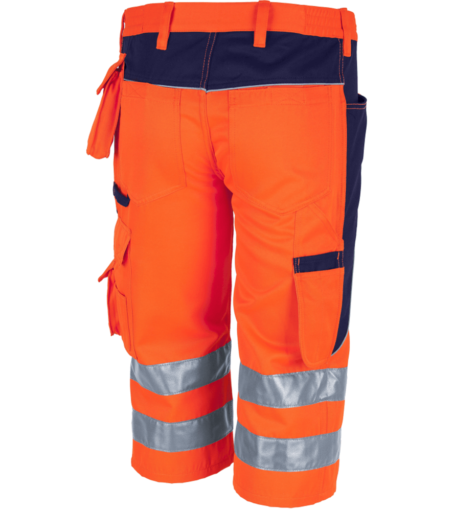 Derékrész 7 bújtató pánttal. Bedolgozott gumírozás a derékrész oldalain. Kalapácstartó. Slicc fém cipzárral. Előformázott térdrész. Jól láthatósági szegélyek az elülső kontrasztszínű részeken és a hátoldalon.