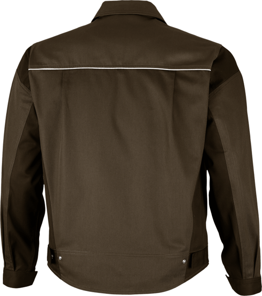 Gallér. Elöl rejtett műanyag cipzárral. Tépőzáras kézelő. Hosszított hátrész. Mozgást elősegítő hátszűkítő. Jól láthatósági szegély a mell- és hátfeltéten.
