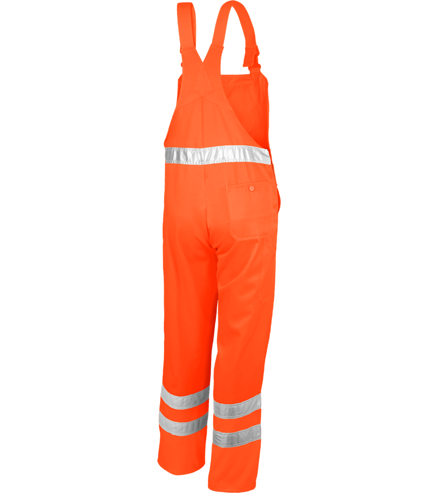 Dupla mellrész, belső mellzseb rejtett Messign-cipzárral. Oldalt gombos derékrész 2 beállítási lehetőséggel. Felhúzott kereszt hátrész. Elasztikus tartópánt biztonsági csattal. Slicc Messing-cipzárral. 1 Reflexcsík (fényvisszaverő) a derékon. Lábanként 2 Reflexcsík (fényvisszaverő). Fluo narancssárga.