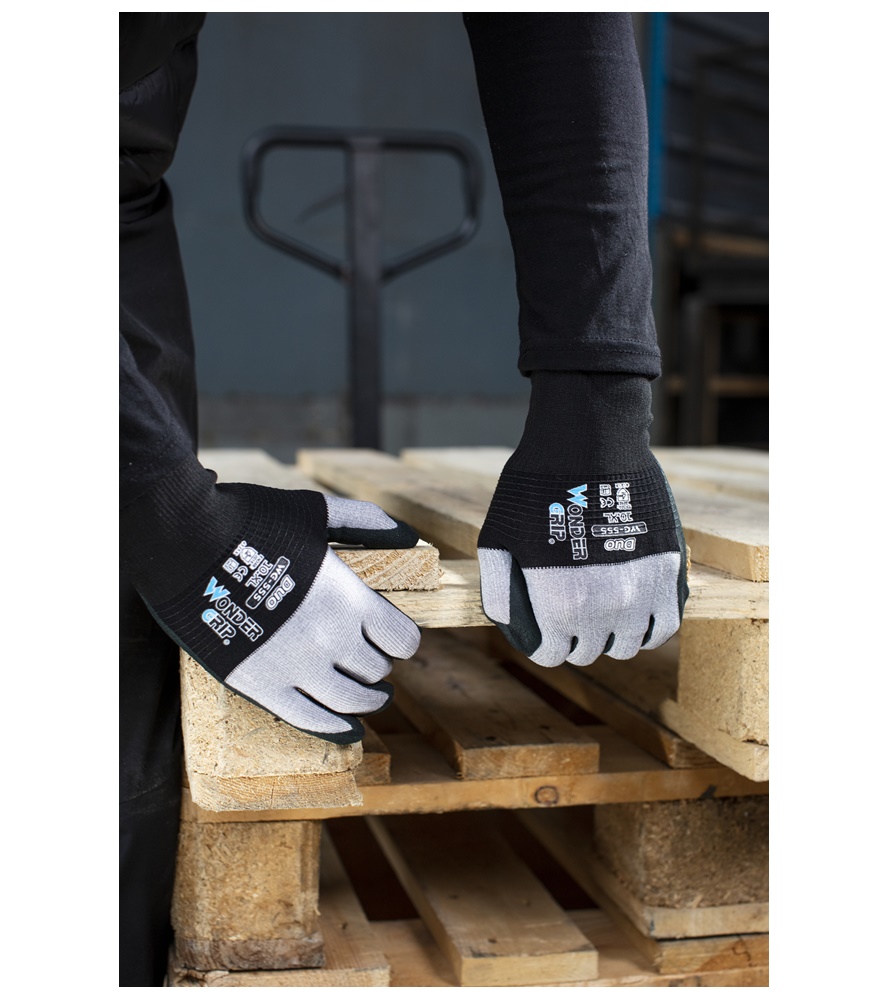 A Wonder Grip® WG-555 Duo az innovatív DuaLiner™-ünkön alapul: a nylon kötött csukló a kéz közepéig ér, hogy szorosan és biztonságosan illeszkedjen, míg a lélegző mikroszálas kötött bélés az öklökhöz és az ujjakhoz kiváló kézügyességet biztosít. , puhaság és ujjbegy pontosság. A WG-555 Duo légáteresztő hab nitril bevonata hozzájárul a kezek szárazon tartásához, és kiváló fogást biztosít a legkülönfélébb alkalmazásokban, így segít leküzdeni a mindennapi munka kihívásait.