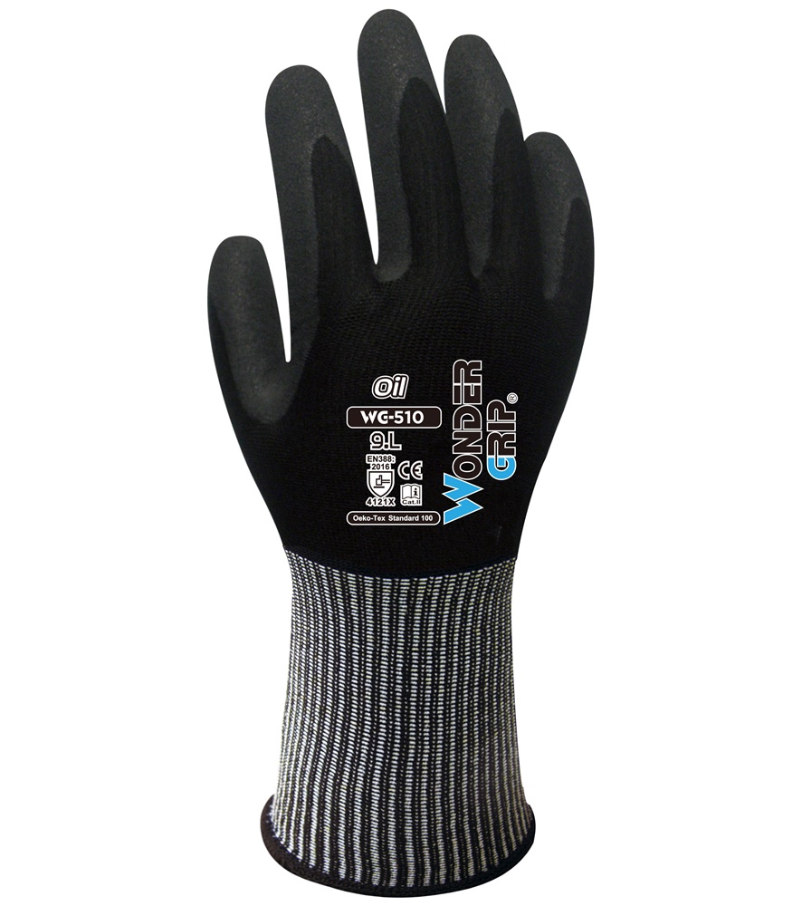 A Wonder Grip® WG-510 olaj 13-as nylon és spandex bélésből készül, kettős nitril bevonattal. Ez a kettős bevonat kiváló olajvédelmet tesz lehetővé, megakadályozza az olaj beszivárgását a kesztyű belsejébe, valamint extra kopásállóságot biztosít. A WG-510 olaj könnyű kézmozgást tesz lehetővé, kiváló hűtést és rugalmasságot biztosítva.